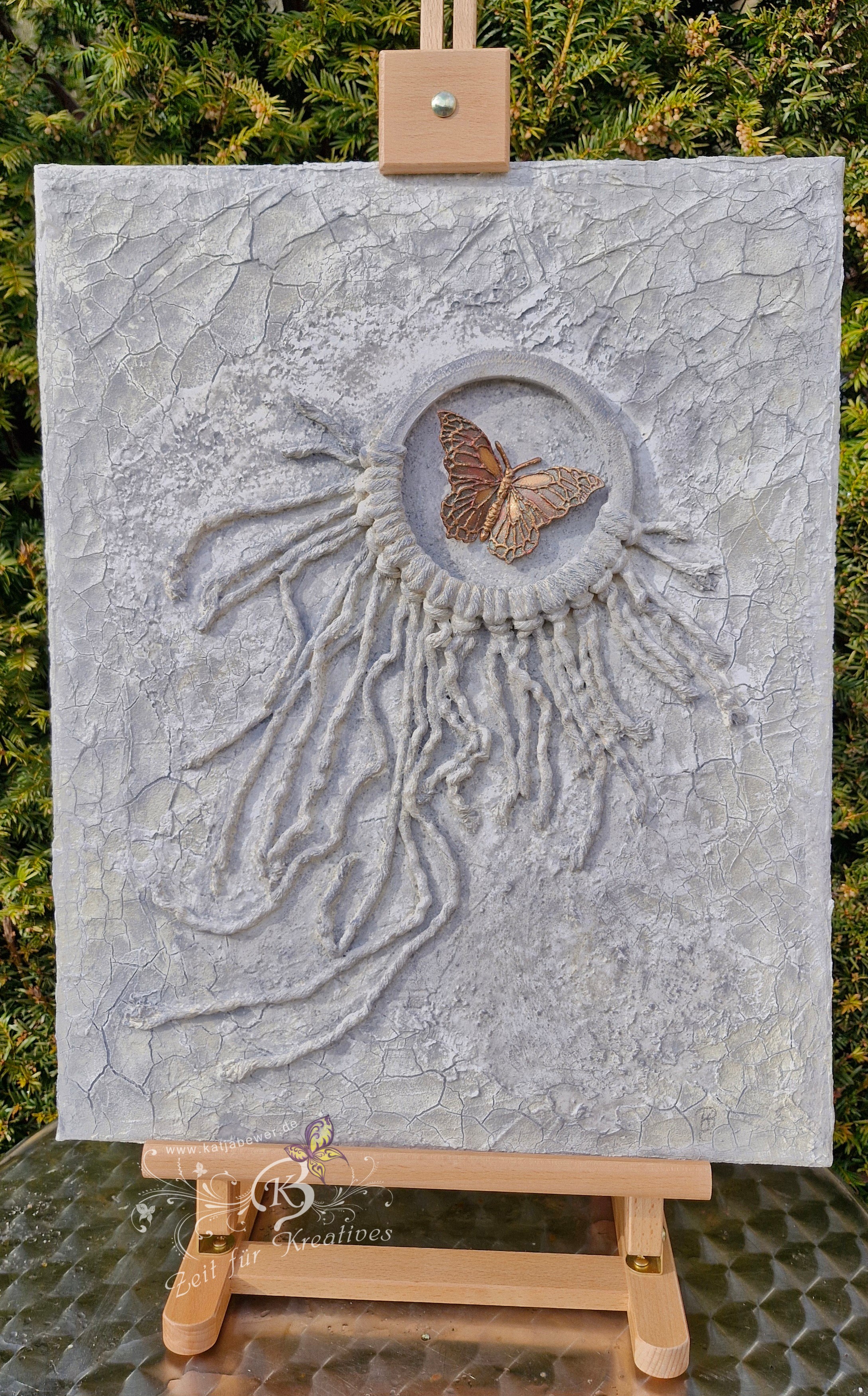 Es folgten viele Schritte mit Gesso, dem aufkleben der Serviette, Crackle Paste und dem aufkleben der Bordüren und Ornamente aus lufttrocknender Modelliermasse.