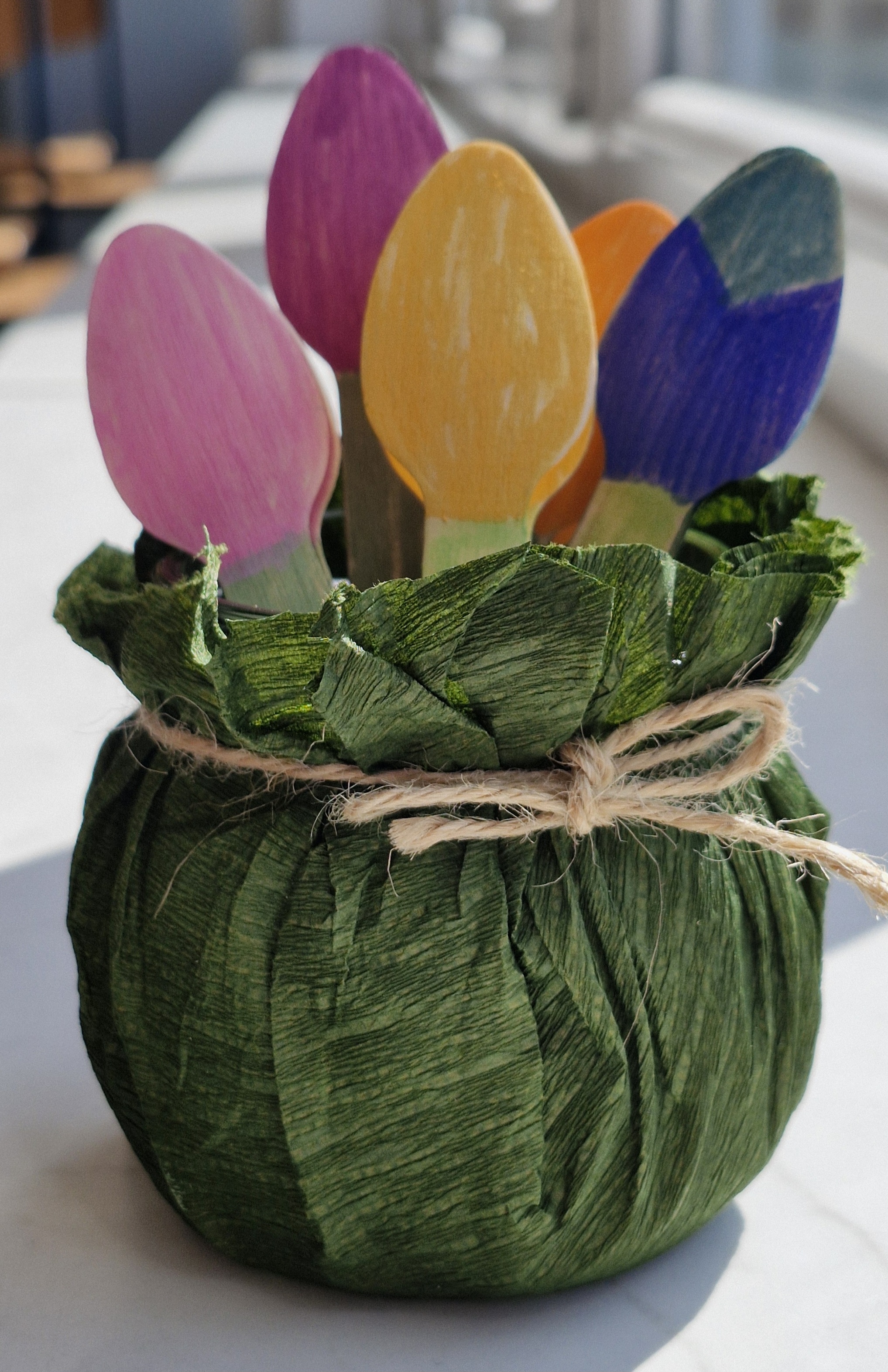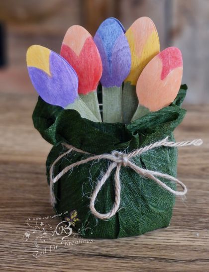 Da im letzten Jahr die Tulpen aus Holzlöffeln auf Osterkarten so gut angekommen sind dachte ich mir wir erweitern das Ganze und machen einen bunten Strauß.