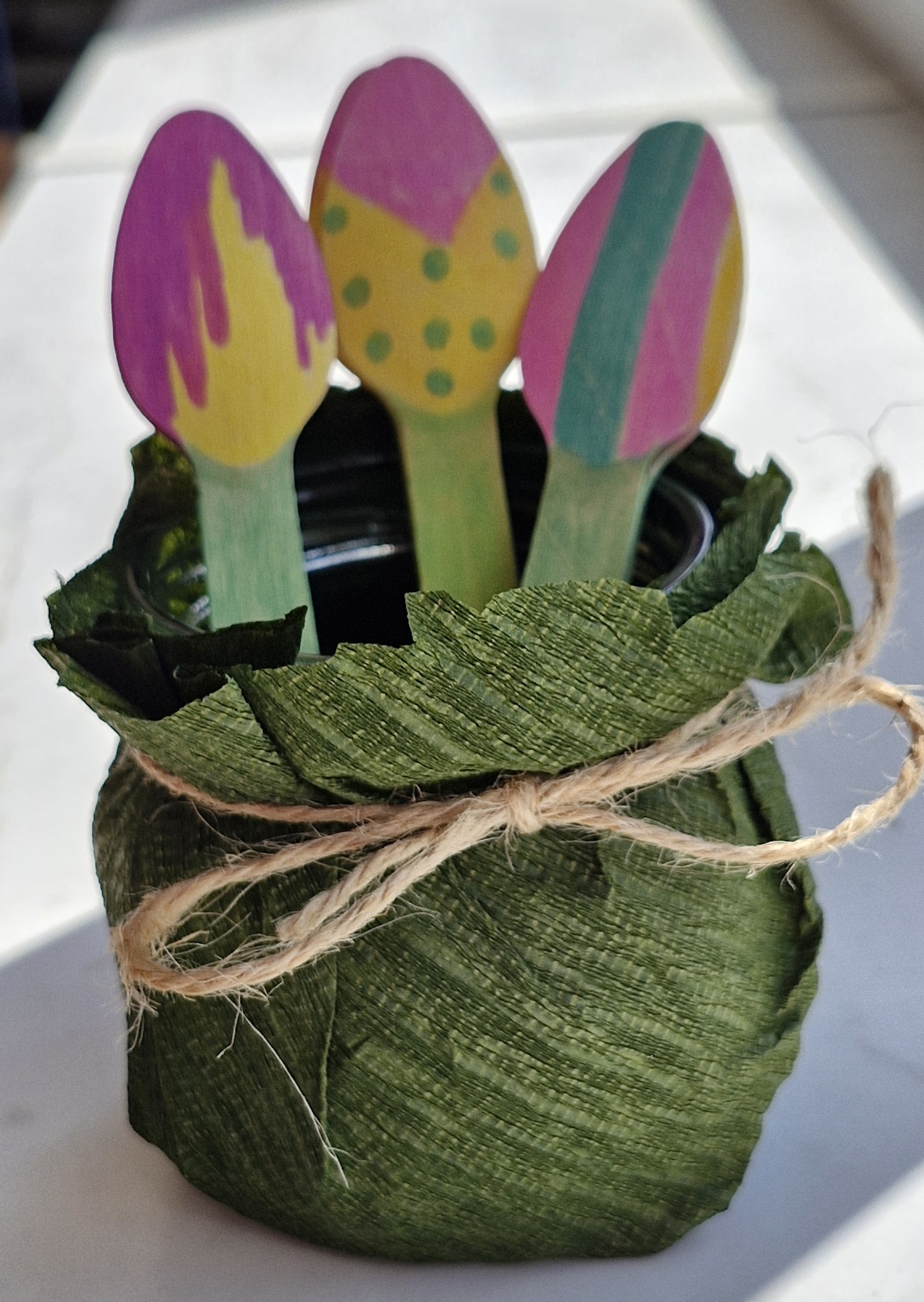 2 Löffel werden ringsum bemalt und dann nur am Stiel gegeneinander zusammen geklebt. So kann man oben an der Blüte auch noch einen kleinen Zettel als Gruß einstecken. Das alte Glas wurde mit Krepppapier zur "grünen Wiese" ;-)