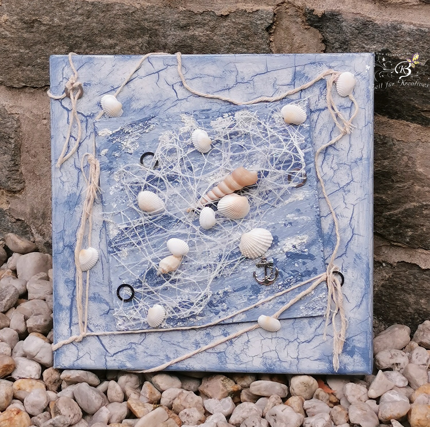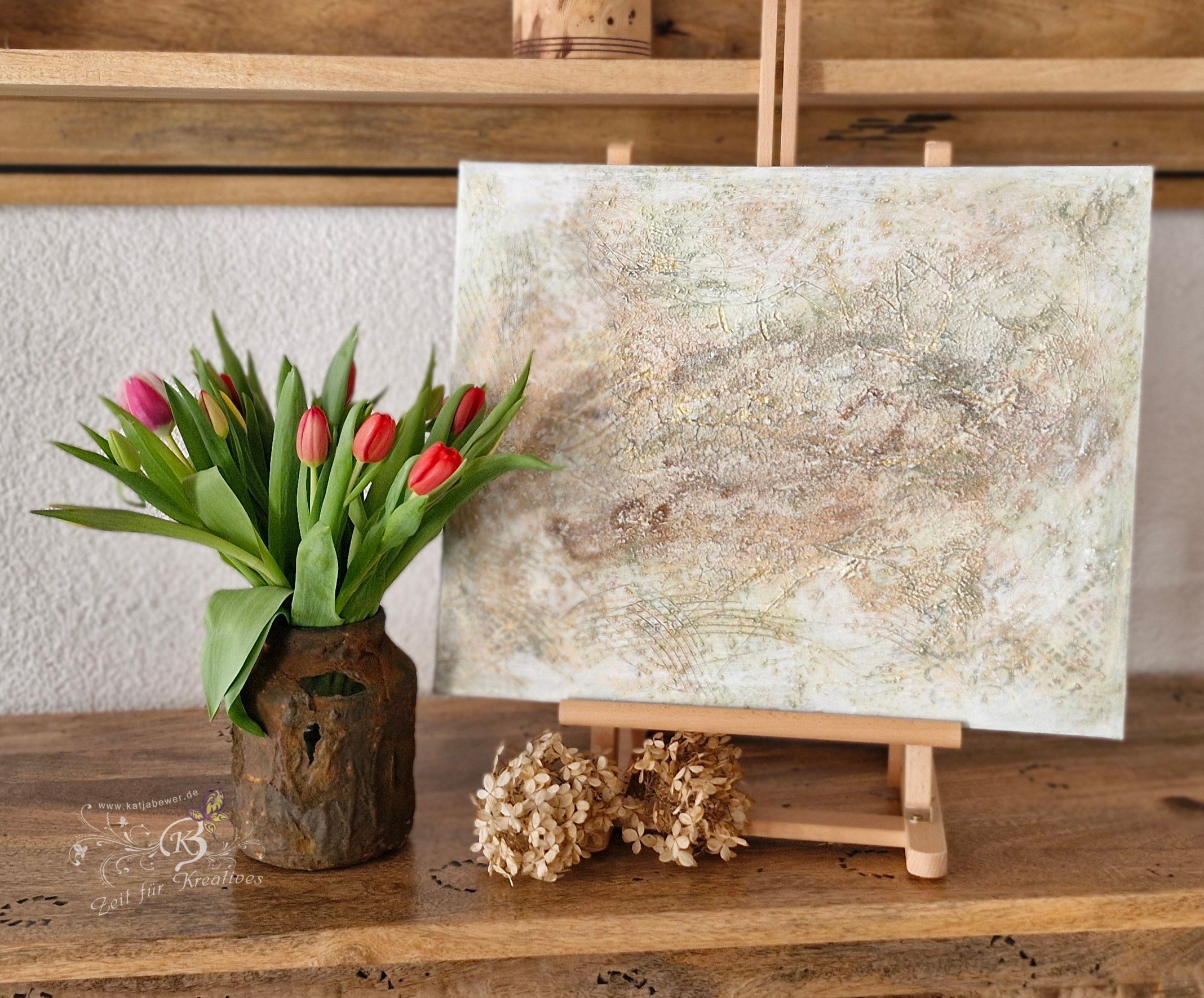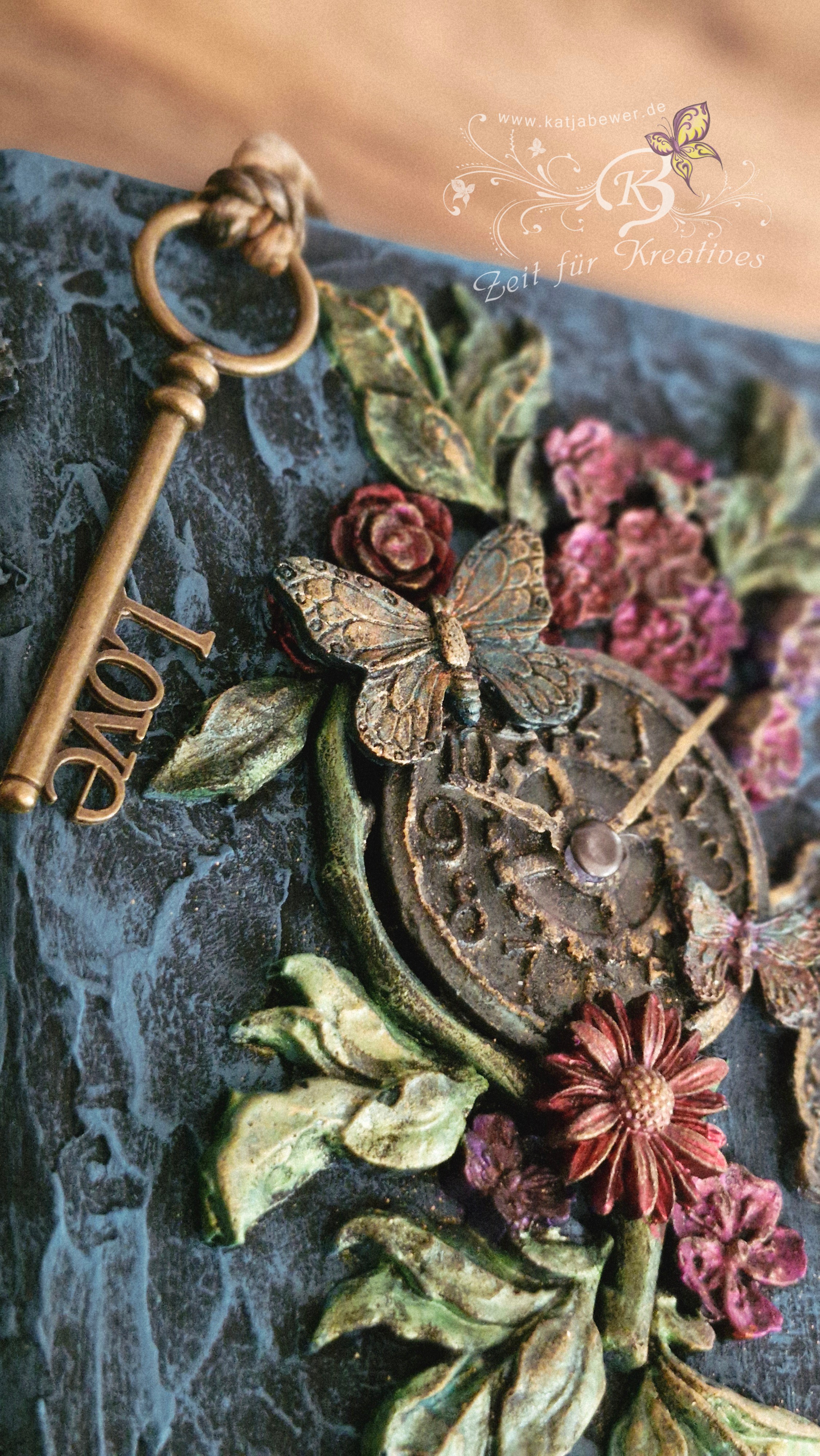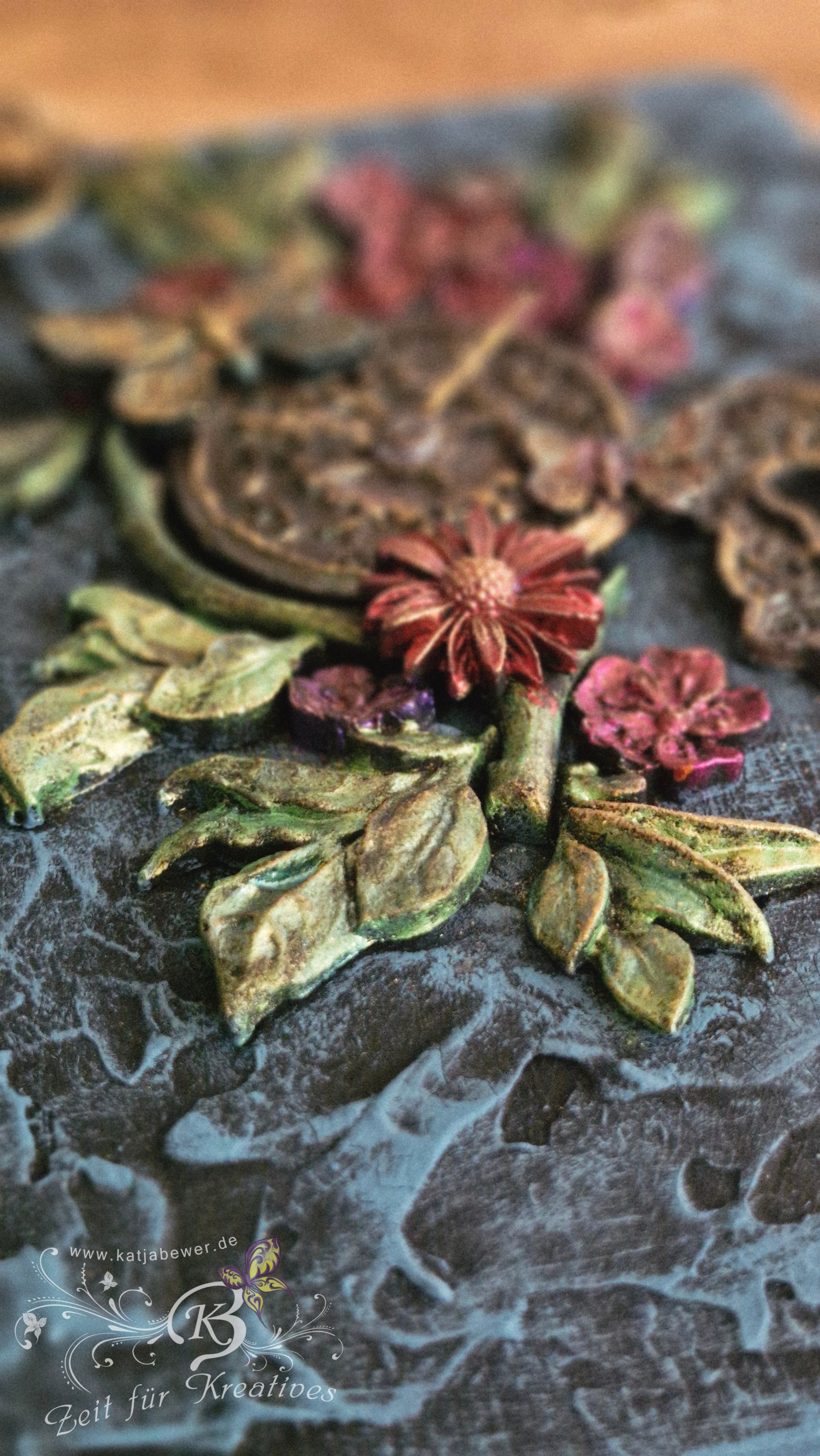 Gearbeitet habe ich mit den Farben von Aquarylic, Strukturen gearbeitet mit Graumehl und Micro-Perlen.