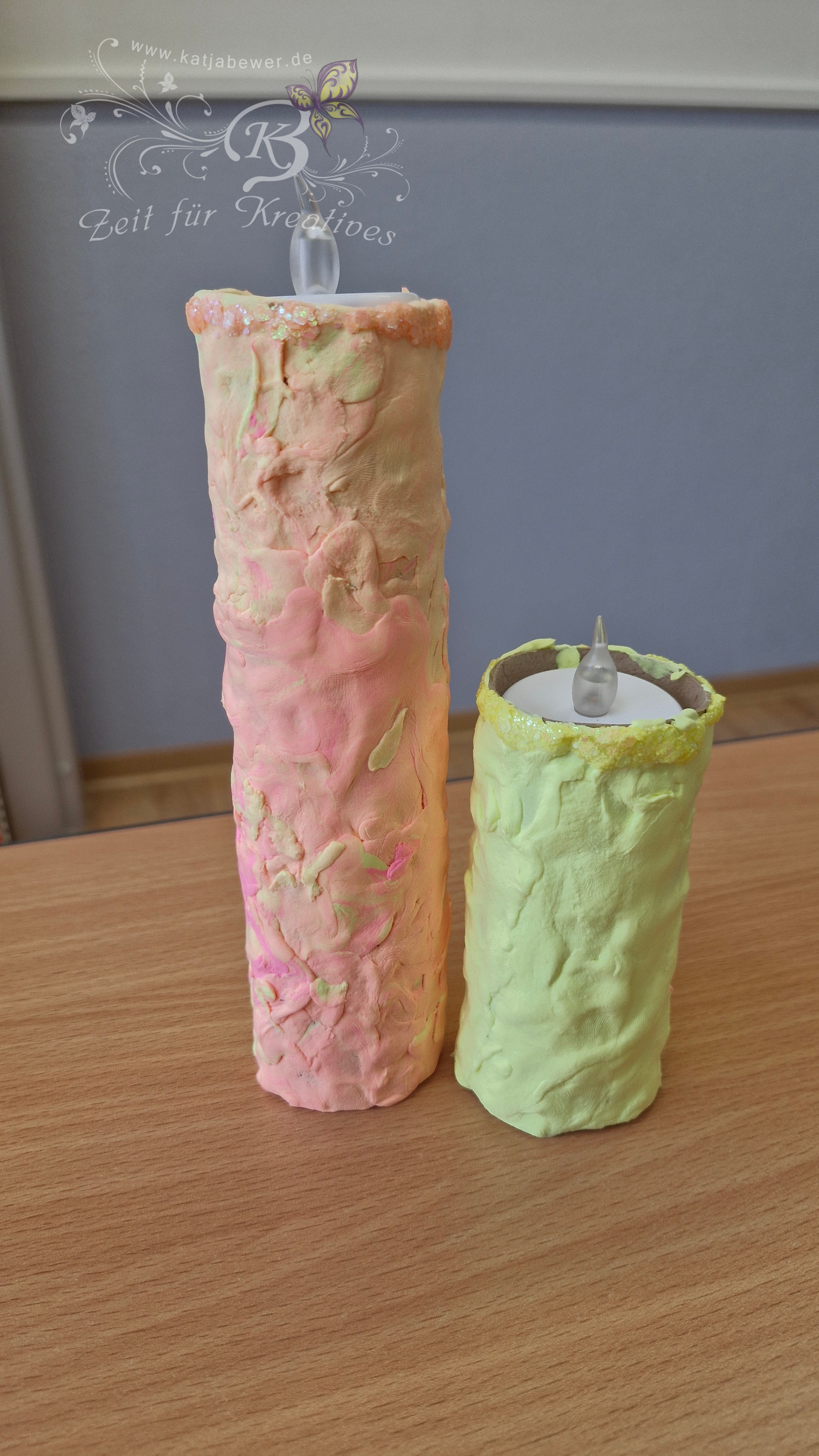 Diese Kerzen werkel ich seit vielen Jahren immer wieder gern mit Kindern. Da aus hygienischen Gründen keine gesammelten Klopapierrollen mehr zum Einsatz kommen sollen verwende ich Mittlerweile die Papprollen vom Küchenpapier und schneide diese auf die gewünschte Große zu.