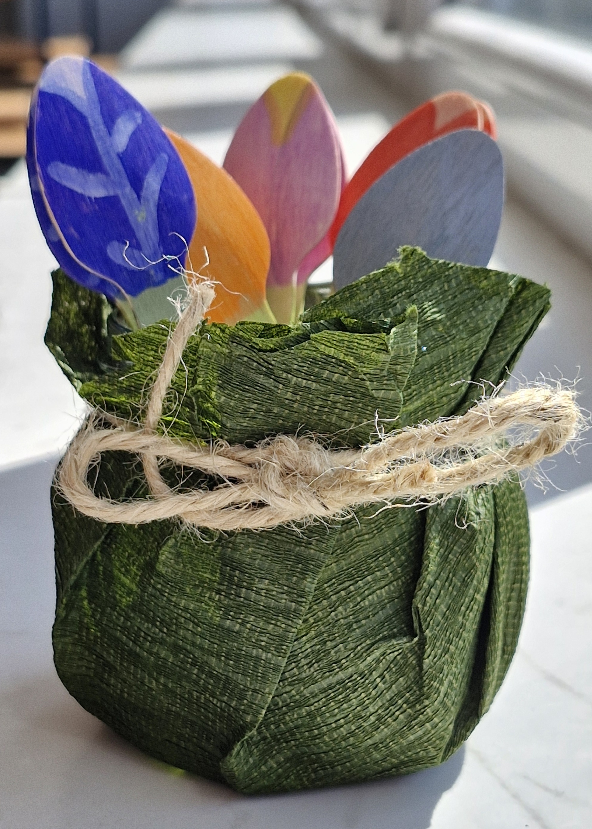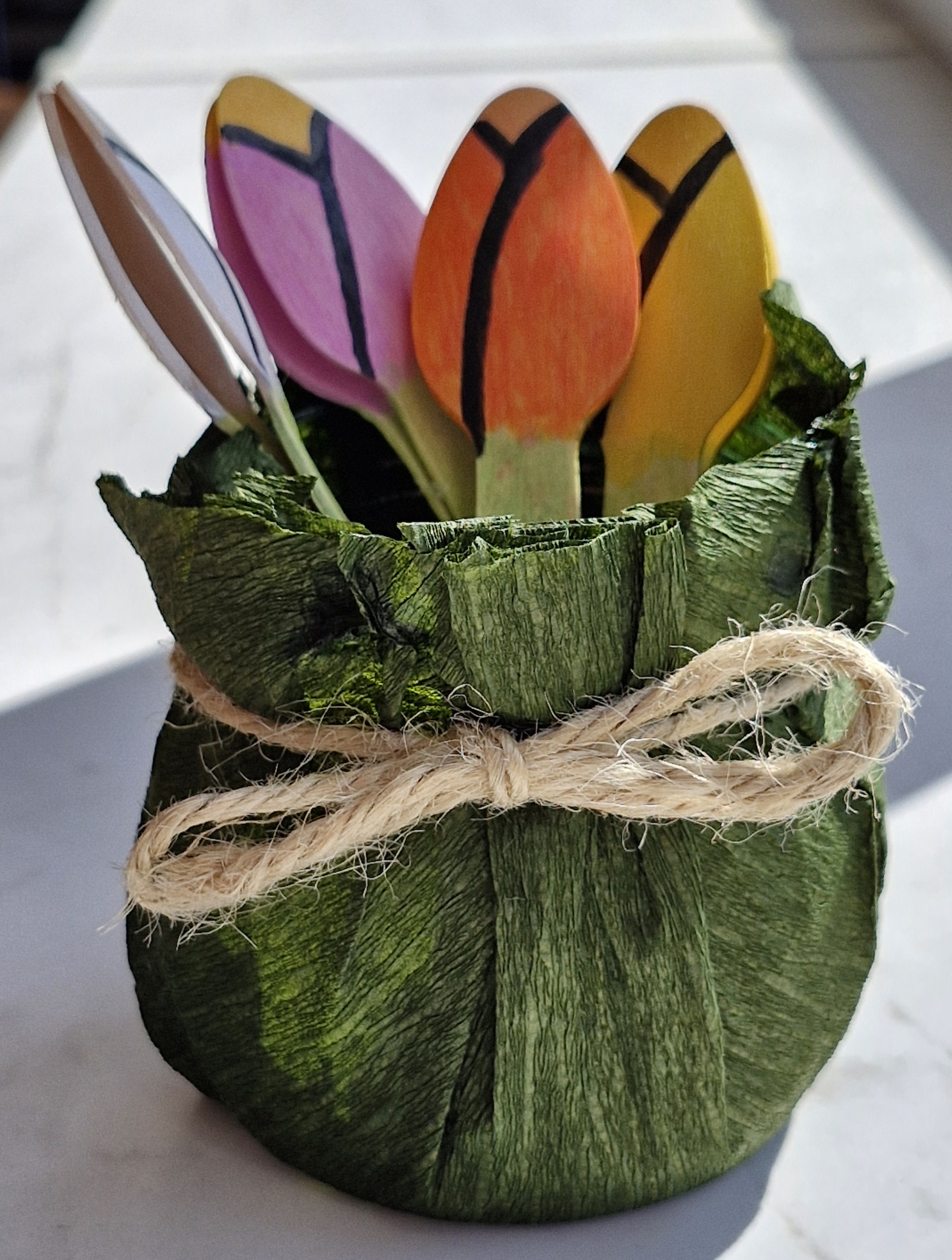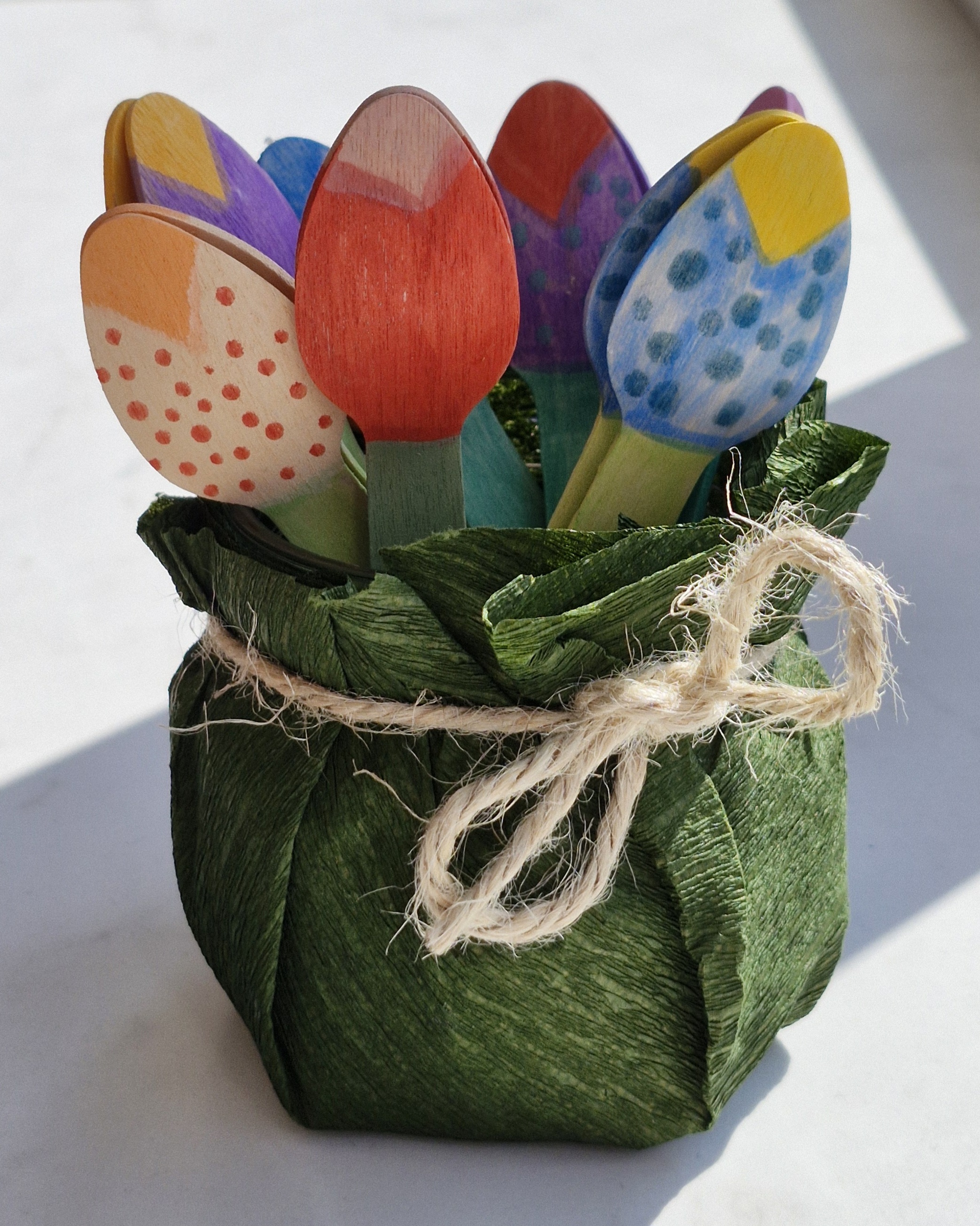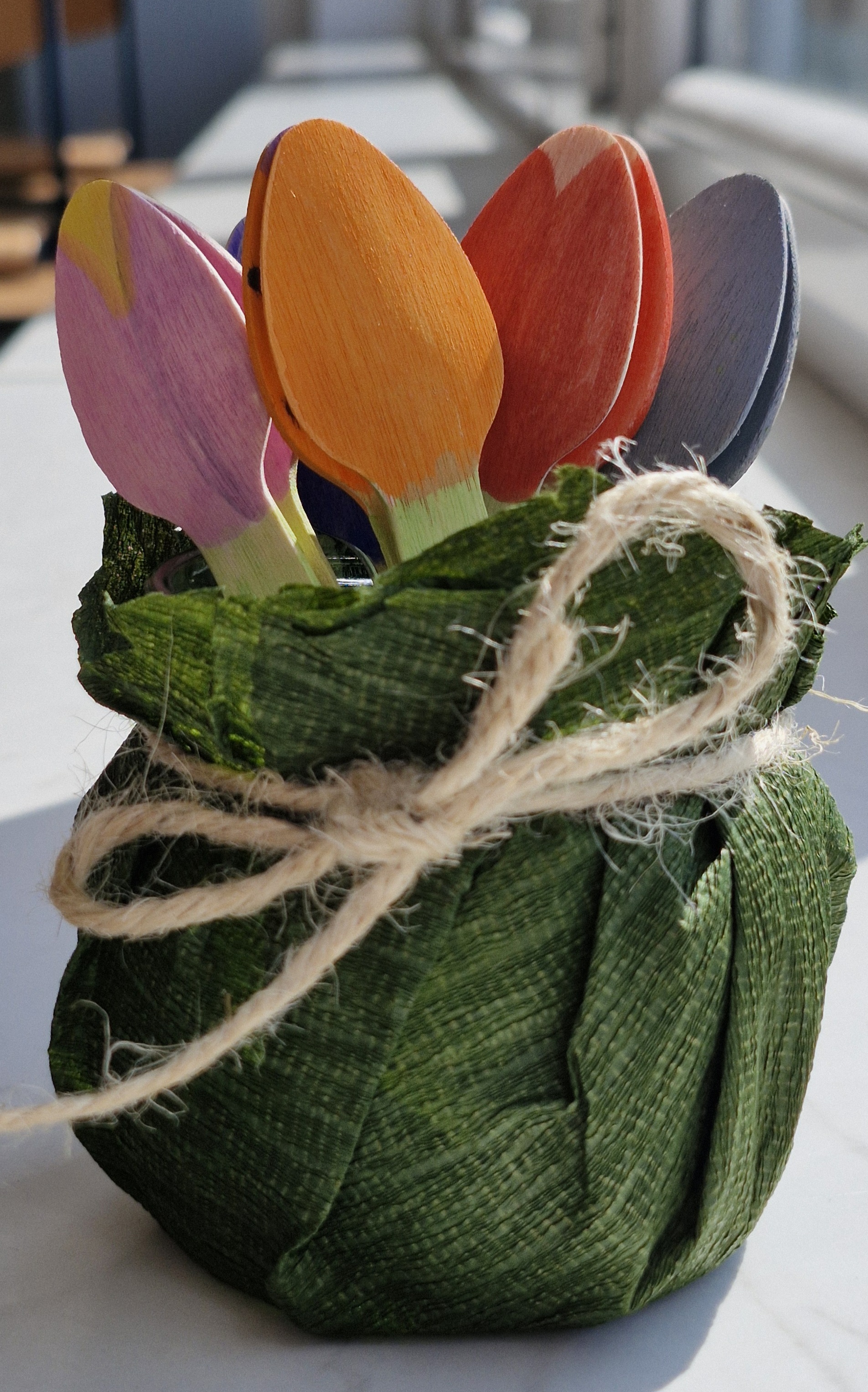 Da im letzten Jahr die Tulpen aus Holzlöffeln auf Osterkarten so gut angekommen sind dachte ich mir wir erweitern das Ganze und machen einen bunten Strauß.