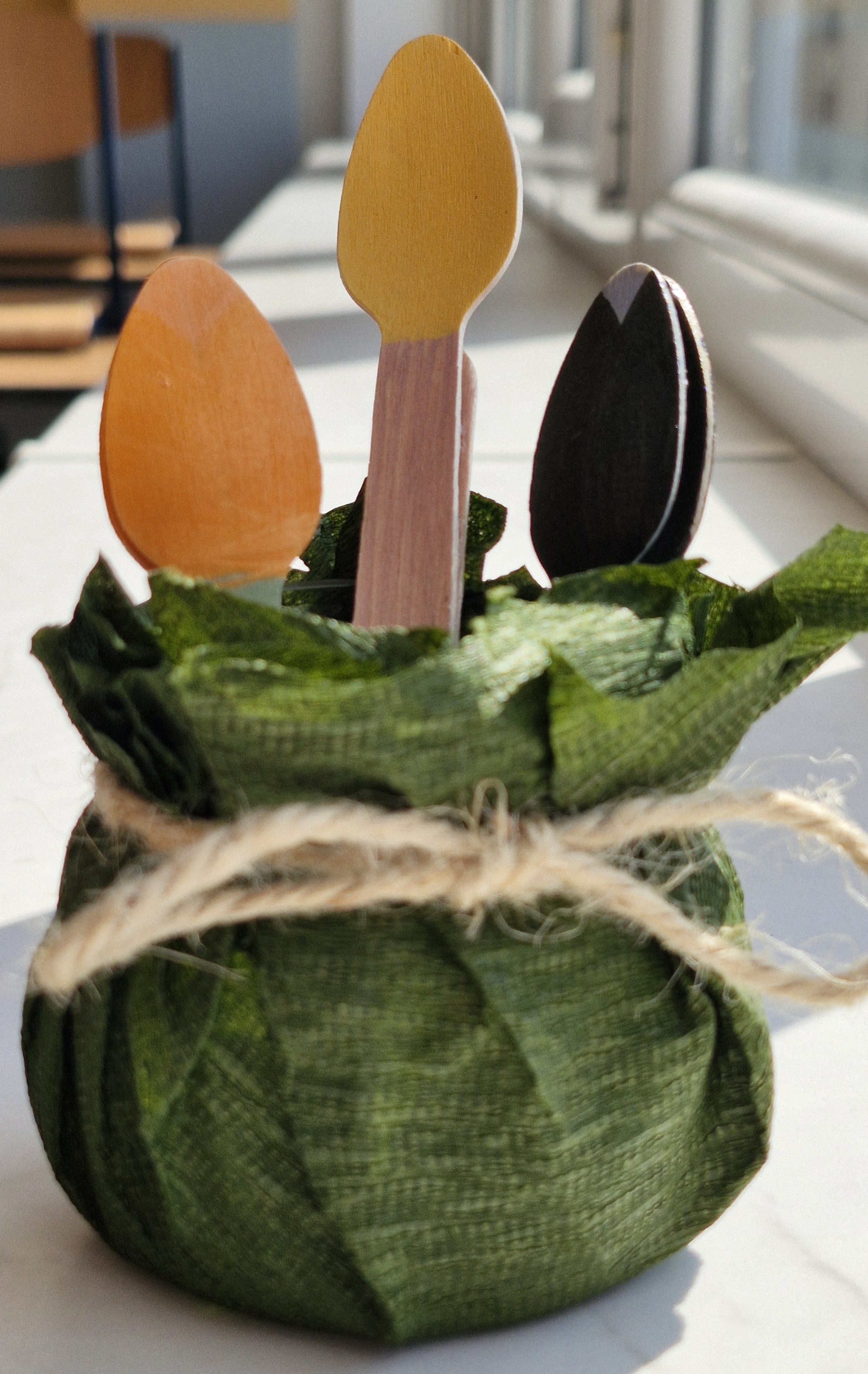 2 Löffel werden ringsum bemalt und dann nur am Stiel gegeneinander zusammen geklebt. So kann man oben an der Blüte auch noch einen kleinen Zettel als Gruß einstecken. Das alte Glas wurde mit Krepppapier zur "grünen Wiese" ;-)